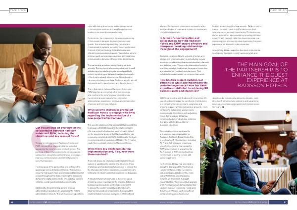 EMW ' s partnership with Radisson for more than 20 years has been marked by significant contributions to IT infrastructure deployment , upgrades and ongoing support across multiple key projects . From configuring networking appliances to revamping Wi-Fi systems and upgrading Cisco Call Manager , EMW has consistently delivered reliable solutions that align with Radisson Hotels ’ business objectives . objectives by consistently delivering reliable , costeffective IT infrastructure solutions and supporting services across various projects and locations over the years . p