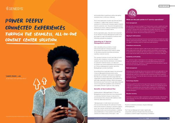“ ManageEngine ' s ITSM solution ServiceDesk Plus successfully reduced the workload of Kuwait Telecommunications Company ' s customer support team . Our solution enhanced the team ' s ability to effectively monitor and resolve problems , enabling early identification of issue patterns and offering solutions for similar issues in the future ,” said