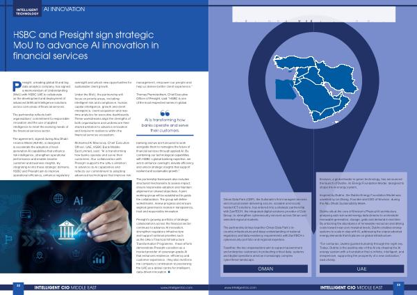 The agreement, signed during Abu Dhabi Finance Week( ADFW), is designed to accelerate the adoption of nextgeneration AI capabilities that enhance risk intelligence, strengthen operational performance and enable smarter customer and business insights. By integrating AI into these strategic domains, HSBC and Presight aim to improve operational efficiency, enhance regulatory oversight and unlock new opportunities for sustainable client growth.